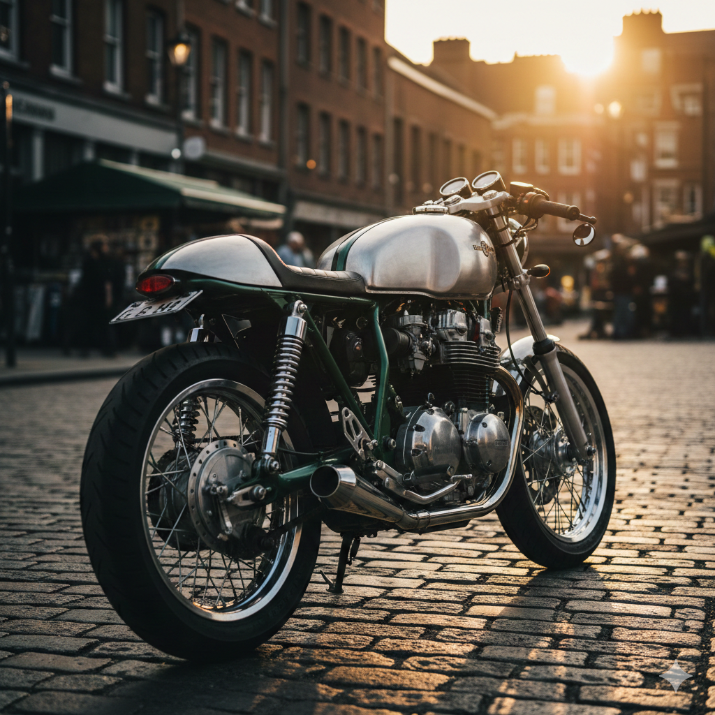 skin-tone optimization visible on matte surfaces. The motorcycle is parked in
